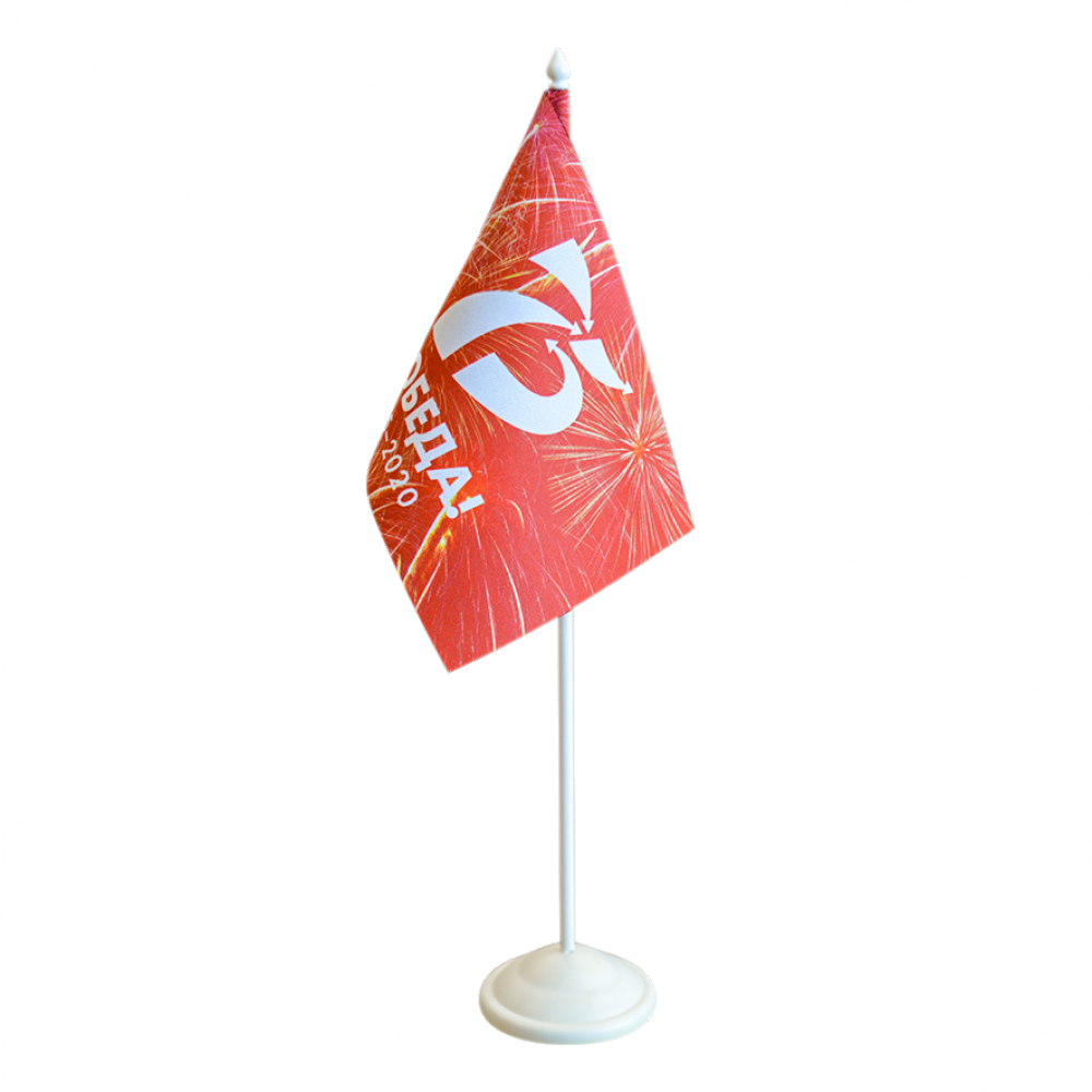 Флажок крепится на специальную настольную подставку с одним или несколькими штоками. Она может быть пластиковой или металлической по вашему выбору. Флагшток заказывается отдельно.