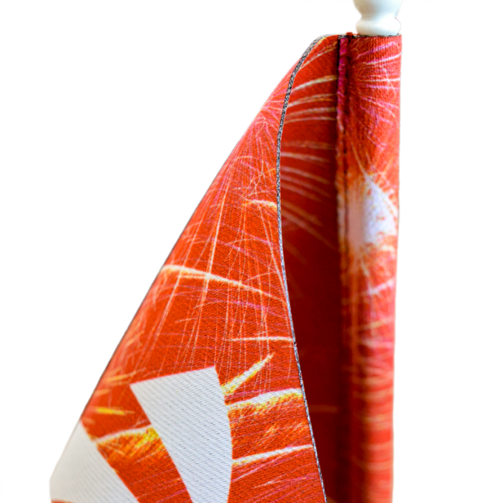 Стандартная обработка тканевого флажка включает в себя: сквозной карман слева шириной 0,8 см, термообрезку по периметру.