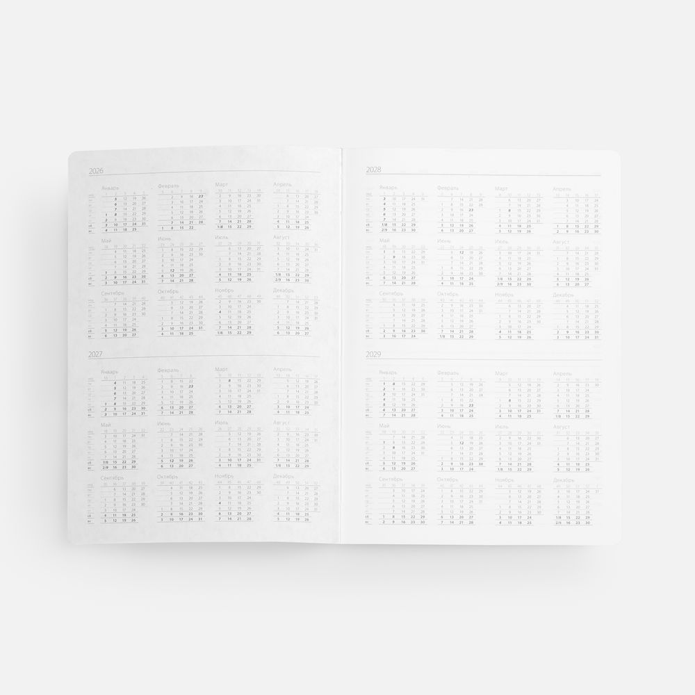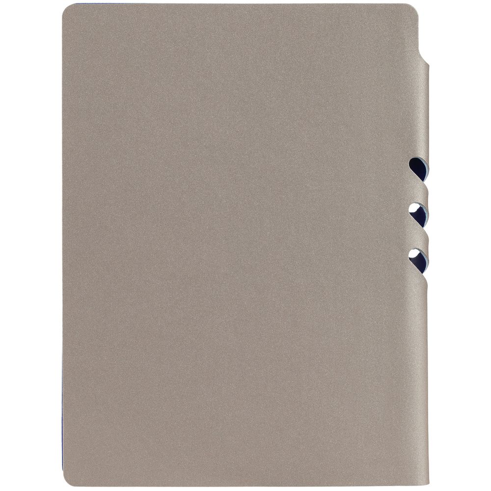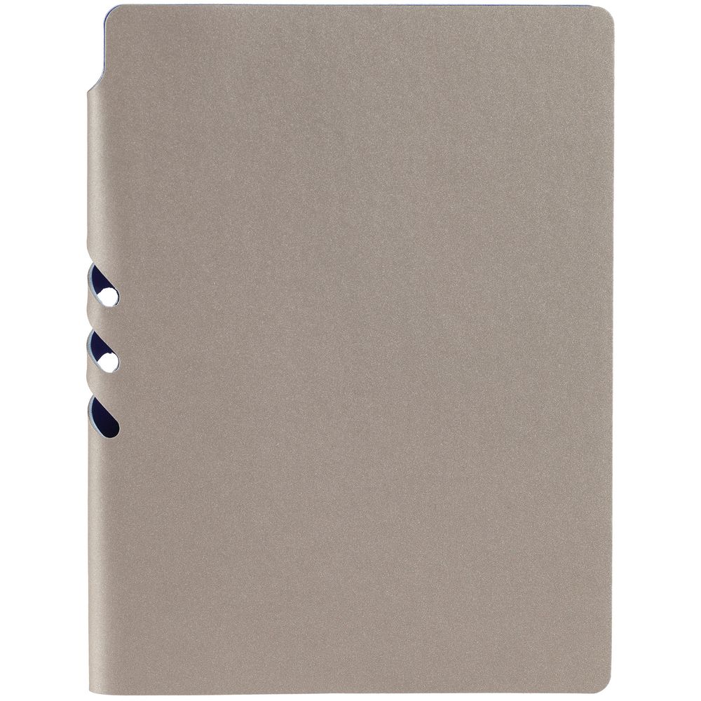 Гибкая обложка выполнена из материала Velour Melange, серый СС и Latte, синий НН (внутренняя часть обложки). Внутри корешка — специальное место для крепления ручки размером до 15х0,9 см.