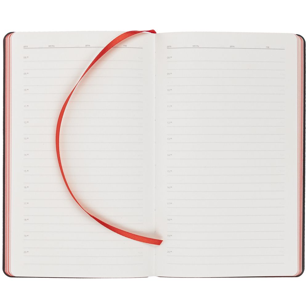 Ежедневник с гибкой обложкой выполнен из материала Nice Touch, черный АА и Soft Touch Ultra, красный РР, дополнен ляссе красного цвета.
