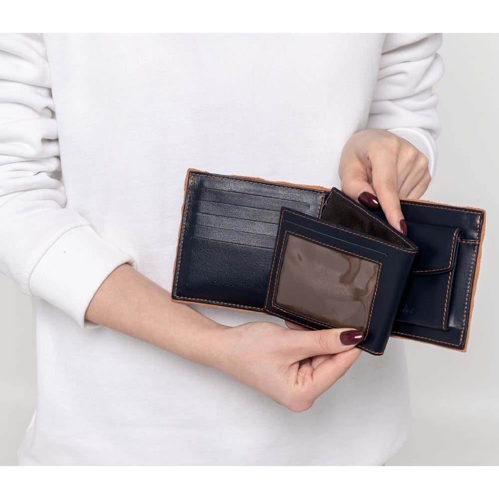 Двойное отделение для банкнот, карман для монет, съемное отделение для пластиковых карт, водительского удостоверения и пропуска.Поставляется в чехле и подарочной коробке.