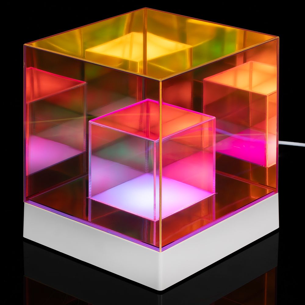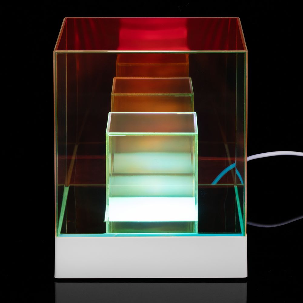 Cubini — интерьерный светильник с разноцветной подсветкой и удивительным оптическим эффектом. Разные оттенки граней и их множественные отражения мгновенно притягивают взгляд, заставляя рассматривать кубик снова и снова.