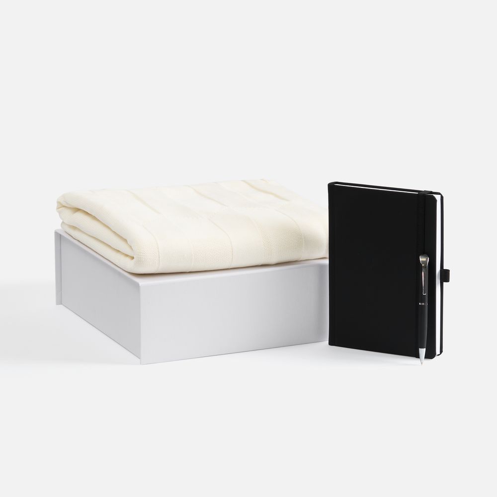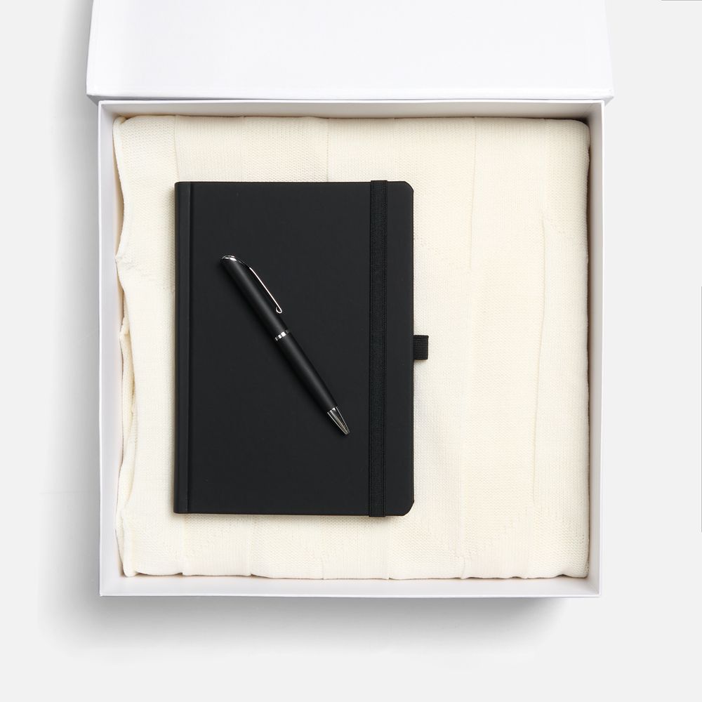 Однотонный набор с основной канцелярией и пледом — классика жанра в уютном исполнении. С компактным ежедневником будет удобно делать заметки в любое время — благодаря петельке для ручки любимый пишущий инструмент будет всегда под рукой. А изысканный акриловый плед с геометрическим узором позволит выразить самые теплые пожелания и ддобавит плавных линий в интерьер.